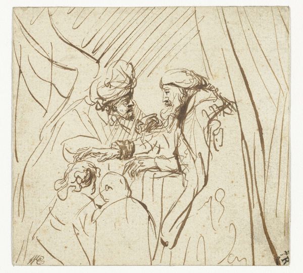 This drawing, "Judith with the Head of Holofernes" at the Art Institute of Chicago, presents a striking scene rendered through the stark contrast of ink on paper. The anonymous artist uses line—hatching and contour—to define form and space in this dramatic biblical scene. Notice how Judith stands dominant, sword in hand, above the limp figure of Holofernes whose decapitated head is carried by an attendant. The composition is structured by diagonals and verticals, creating a dynamic tension that draws the eye across the scene. The artist's open, linear style, rather than obscuring the composition, emphasizes the graphic quality of the narrative. The formal language of the drawing invites us to consider the function of these visual elements as signs. The sword, the severed head, the posture of Judith—all are potent signifiers within a semiotic system of power and gender. The artist uses these to challenge fixed meanings and engage in a dialogue about strength, morality, and representation. Ultimately, the drawing’s power lies in its formal arrangement, a structure that supports a narrative rife with complex cultural and philosophical implications. This framework allows for multiple interpretations, inviting viewers to continually re-evaluate the artwork.