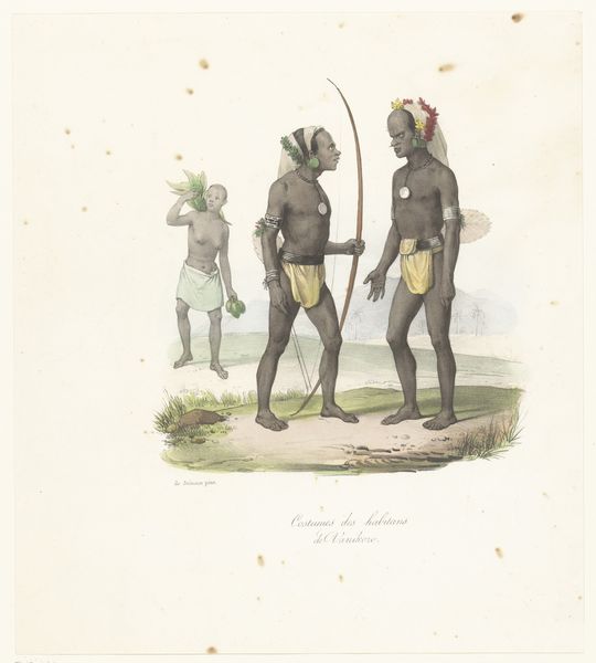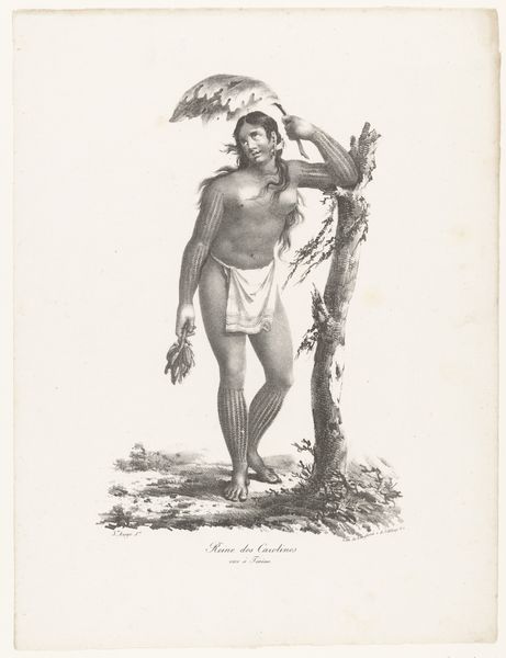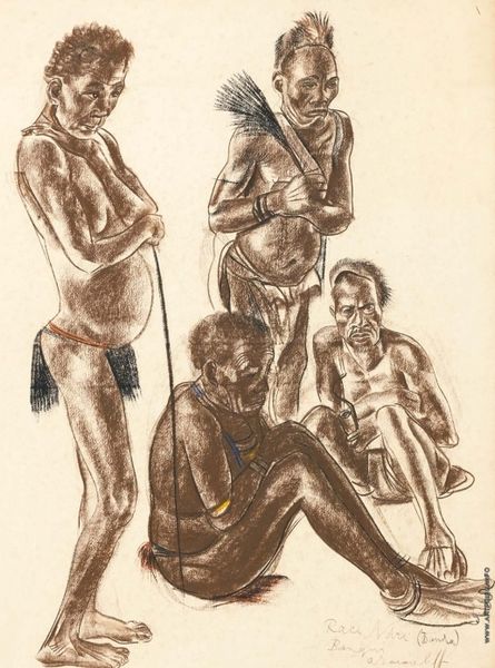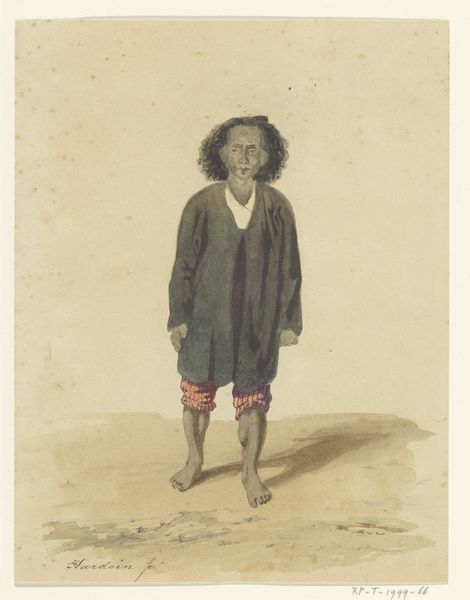 Curator: Let’s turn our attention to this intriguing piece titled "Zittende man, afkomstig van de Oostelijke eilanden, met wit broekje"—Seated man, from the Eastern islands, with white shorts. It's attributed to Ernest Alfred Hardouin and dates from approximately 1837 to 1854. The artwork uses watercolor and pencil. What’s your initial take? Editor: Stark. Almost severe. The contrast of the dark figure against the pale beach and sky, the man’s intense gaze… there's a disquieting directness to it. The brushstrokes are quite economical. Curator: Yes, Hardouin certainly employs a minimalist technique. Observe the composition: a triangular structure anchors the seated figure, while the horizontal lines of the beach and ocean emphasize stillness. The muted palette reinforces this sense of quietude, yet that starkness you mentioned is definitely present. It is beautifully simple in construction. Editor: It’s the "white shorts" that puzzle me, though. It clashes somewhat with the perceived "authenticity" or "naturalness" the scene attempts to evoke. Is it perhaps symbolic of colonial presence? The imposition of European mores? I also wonder if his pose carries cultural significance within his community, since Hardouin noted that he came from the East. Curator: That's a keen observation. The "white shorts" could represent cultural intrusion or perhaps even a sign of the sitter's adaptation to colonial influence. Hardouin might have included it intentionally to express the dynamic interaction between cultures. Editor: And perhaps the beach itself… it functions as a liminal space, a border zone where cultures meet and perhaps clash. The water and the sand, a representation of the subconscious meeting the conscious world, and the individual situated in that cross section, so to speak. The drawing isn't merely a portrait; it's a cultural document of a time of enormous and difficult shifts. Curator: A perceptive reading. Hardouin captures not just the physical appearance but also the psychological and cultural space the man occupies. There's a lot of symbolic weight packed into such a seemingly simple plein-air drawing. Editor: It offers a stark window into a complex historical moment and human experience. I leave with a far deeper respect for the artwork. Curator: Indeed, a brilliant observation about the meeting of civilizations in the Pacific from the past.