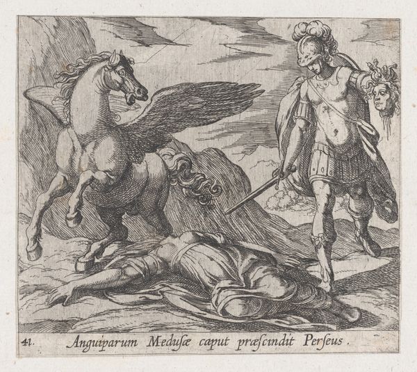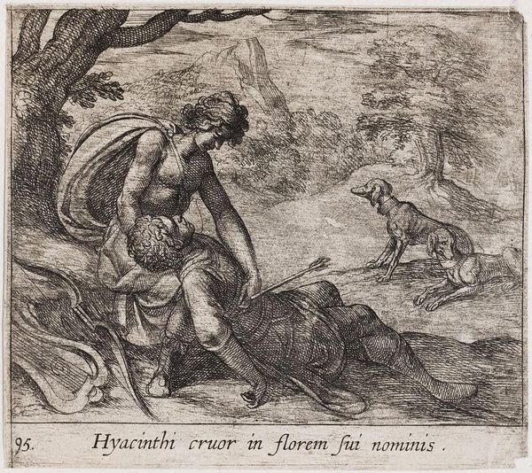 Editor: This is "Plate 95: The Death of Hyacinthus," an etching and engraving by Antonio Tempesta from 1606. It depicts a really tragic scene. What details do you notice right away, and how do you interpret this work? Curator: Immediately, I see the dense web of lines – the product of labor – that create this landscape. The very act of producing a print, like this engraving, makes art reproducible and thus challenges traditional notions of unique, auratic artworks. What about the landscape, how does it play into the scene’s production? Editor: It does create a theatrical stage, of sorts, amplifying the emotions…and it’s not just about individual drama, but this print's availability means more people engaging with Ovid's stories! Curator: Exactly. Consider also the economic exchange: Tempesta created this to be consumed, to generate wealth. How do the materials themselves – the copperplate, the ink – dictate the style? Editor: I suppose the fine lines are almost dictated by the etching process. But beyond materials, does Tempesta’s choice to depict a classical myth – from Ovid’s ‘Metamorphoses’ - mean anything in terms of the labor involved? Like, compared to, say, genre scenes. Curator: It signals a sophisticated audience, capable of consuming classical narratives, but more interestingly, his choice elevates printmaking. Mass production need not only portray everyday life, but can disseminate 'high' art, thereby challenging the art world’s established hierarchy. What do you make of this 'Italian Renaissance' label in connection with labor and production we've discussed? Editor: Interesting. The "Italian Renaissance" label now seems to apply not just to style, but also to Tempesta's business approach! Thanks, I’ll be looking at art production through this lens from now on! Curator: Indeed, the lens of materiality and labor can unlock fresh interpretations of even well-known images.