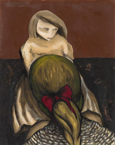 Curator: We're standing before Niko Pirosmani's "Actress Margarita," created around 1909. The painting is part of the Art Museum of Georgia's collection here in Tbilisi. Editor: My immediate response is one of dreamy unease. There's something quite haunting about the flattened perspective, the stark coloring and Margarita’s rather ghostly visage. The birds especially evoke an ominous premonition. Curator: Pirosmani's technique often incorporated impasto, where the paint is thickly laid on the surface, giving a tangible, textured quality. He painted on oilcloth, often black, using the dark background to create stark contrast. It was part of his attraction to working-class bars and inns, where they often provided canvases or even walls. It’s also aligned to his unique outsider status as an artist with little or no formal training. Editor: It does feel very much outside of academic art traditions, pushing beyond formal portraiture. Given that the actress Margarita de Sevres, as the story goes, left Pirosmani heartbroken, the somewhat frozen portrayal becomes imbued with intense melancholy. Look at how her hands are positioned, passively open—they indicate an absence of control, a yielding to the circumstances of her situation as an artist and perhaps to an unhappy, doomed romance. The folk art sensibility, too, pulls on traditions outside of academic representation. Curator: Pirosmani’s romantic, even naive, style drew on local culture and tradition. He romanticized an idea of Georgia, capturing everyday life. It can be analyzed from both romantic and politically symbolic views, though. How does this intersect, do you think? Editor: I would suggest it emphasizes the limited, objectified roles of women in Georgian society and art. While Margarita is ostensibly the subject and object of Pirosmani’s longing and artistic impulse, what are we actually learning *about* her beyond his interpretation and fantasy? We, as observers, need to acknowledge our role in sustaining a similar tradition. I can’t see this work outside of that conversation now. Curator: Those points are helpful in approaching an iconic yet very elusive character and painting within Georgia’s art history. Thanks for drawing that all out, looking at the wider context. Editor: It's crucial to understand how gender and socio-political issues contribute to our understanding of historical art and how they impact current issues and perspectives. Thanks, as ever, for bringing your own insights to this fascinating portrait.