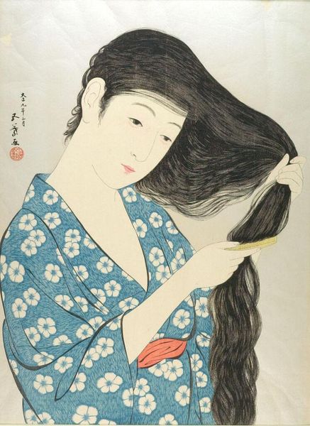 Kiyokata Kaburagi created ‘Cosmetic Powder’, using delicate lines and subtle washes of color. Notice how Kaburagi masterfully uses a limited palette to evoke a sense of quiet intimacy. The creamy, porcelain skin of the woman is contrasted with the deep, almost brooding tones of her kimono. Her posture, with her head slightly bowed, invites us into a private moment of reflection. Kaburagi plays with the geometry of traditional portraiture, softening the lines and blurring the boundaries between figure and ground. This work challenges the conventional modes of representation, emphasizing the psychological depth of the sitter. It is the formal elements – the carefully controlled palette, the subtle gradations of tone, and the delicate rendering of form – that give the work its emotional resonance. By challenging fixed modes of representation, Kaburagi invites us to reconsider our relationship to both the sitter and the artistic process.