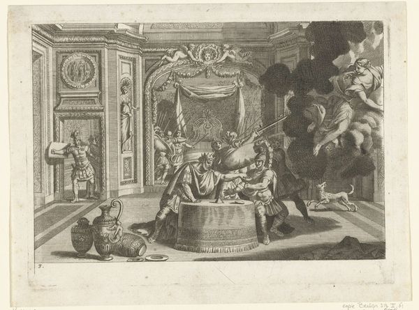 Jan Goeree created this drawing, A Reconstruction of an Undefined Building, using pen and brown and gray ink with gray wash. The composition is divided into distinct visual realms that create a dialogue between the architectural and the pastoral. The left side presents a meticulously rendered, albeit fragmented, classical building. Its ruined state suggests a commentary on the decay of civilizations and architectural forms. The use of monochrome wash emphasizes the geometric structure and the play of light across the columns, arches, and dome. In contrast, the right side introduces a whimsical grouping of cherubic figures amidst foliage, evoking a sense of playful animation. This juxtaposition establishes a symbolic binary between order and chaos, ruin and renewal. The three coins in the lower left hint at deeper cultural narratives related to power and memory. The use of line and wash blurs the lines between representation and abstraction, thus challenging fixed meanings.