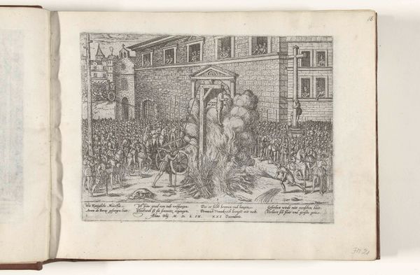 Frans Hogenberg’s hand-colored etching depicts the execution of Anne de Bourg in 1559. The image is a stark reminder of religious conflict during the Reformation. De Bourg, a member of the French Parliament, was a vocal supporter of Protestant ideas and openly criticized the persecution of Protestants in France. As a result, he was arrested, condemned as a heretic, and publicly burned at the stake in Paris. The scene shows a crowd gathered around a gallows, with de Bourg suspended above a fire. The faces in the windows of the building behind the gallows underline the public spectacle of state-sanctioned violence. Hogenberg's print captures a pivotal moment in the religious and political landscape of 16th-century France. The print circulated as a form of propaganda during a period of intense religious conflict and the narrative promoted by this type of imagery played a significant role in shaping public opinion. Historical research into pamphlets, sermons, and other visual materials from the period could further contextualize this image and its role in the religious conflicts of the time.