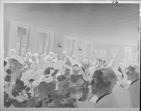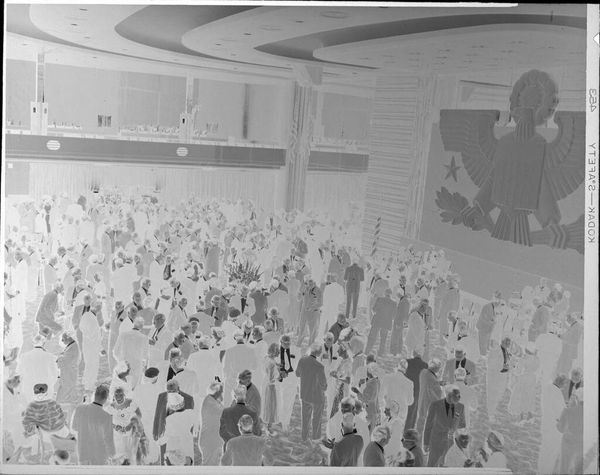 Editor: This is an untitled photograph, taken by Peter James Studio, showing a banquet with long tables. The negative format gives it an eerie feel. What can you tell me about the social context of a scene like this? Curator: It's fascinating how the photographic negative transforms a celebratory scene. Consider the socio-political implications of who is included and excluded from such gatherings. Do you notice any patterns in the representation of the attendees? Editor: Well, everyone appears to be a man, and they all seem to be dressed formally. Curator: Exactly. This image speaks volumes about power structures and social hierarchies. Reflect on how the act of documenting this banquet reinforces or challenges those structures. What statement do you think the photographer might be making, intentionally or otherwise? Editor: I hadn't considered that. It really does change how you view a simple banquet scene.