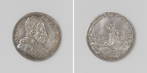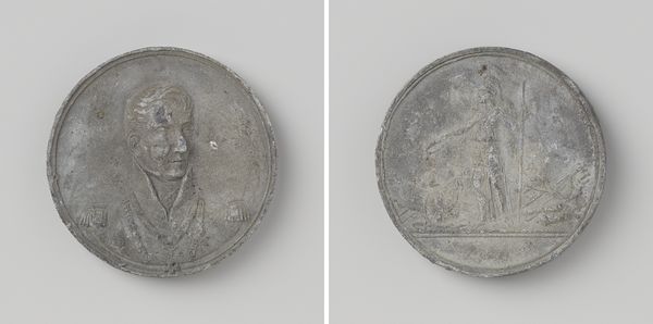 Editor: This intriguing metal piece, titled "Grave door prins Willem III ingenomen" and created in 1674 by Roelof Hensbergen, seems to commemorate a historical event, perhaps a victory. The detailed portrait contrasts with the rather faint image on the back. How do you interpret this work, especially considering the symbolism inherent in medals? Curator: Indeed, this is a fascinating example of how medals served as powerful vehicles for cultural memory. The portrait of Prince William III, with its Baroque flamboyance – the flowing wig, the elaborate attire – speaks to the power and status he held. Look closely at the inscription around the portrait; those words carry weight, legitimizing his actions and framing his legacy. Editor: It almost feels like propaganda, a carefully crafted image. Curator: Precisely! Medals are rarely neutral. What event do you think the reverse depicts? Editor: I can make out figures and architecture, but it's too vague to say for sure. Is that a grave they have captured? Curator: The imagery likely refers to a specific military conquest, linking William III to a lineage of successful leaders. The 'grave door' might symbolize overcoming death and enshrining William’s own legacy. What emotional response does the contrast between the portrait and the event evoke? Editor: The portrait is idealized and immediate; the scene on the reverse feels distant and faded. It emphasizes the power of the individual over the historical context. The power of personality is preserved and triumphs. Curator: An excellent observation. It highlights how carefully constructed symbols solidify cultural narratives and individual importance within historical memory. Editor: This has revealed how visual symbols encode memory. I’ll never look at medals the same way.