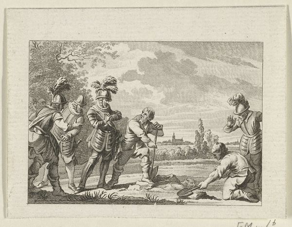 Editor: So this engraving, "Christoffel Columbus komt aan in Amerika" from 1788 by Reinier Vinkeles, depicts Columbus's arrival. The print's detail is incredible, yet there’s this inherent sense of staged drama that I find unsettling, almost like a theatrical production of colonialism. What stands out to you in this piece? Curator: What jumps out is not just *what* is depicted, but *how* it's rendered. Look at the precision of the engraving, the labor involved in creating this image for mass consumption. This wasn't about capturing a raw "truth," but about constructing a narrative, carefully etching an ideology of conquest for widespread distribution and absorption by a Dutch audience. Consider the raw materials used – the metal plate, the ink, the paper – and the systems of production that made this image available to many. Editor: That's interesting. The precision seems almost celebratory, which jars with the knowledge of what followed colonization. Does focusing on the materials used shift our understanding of the work's message? Curator: Absolutely. By foregrounding the process and materials, we're pushed to question the intent. Vinkeles wasn’t just illustrating history; he was participating in its construction through readily available consumer goods: the print itself. The very act of producing and circulating such images normalized this historical view, turning colonization into a digestible and marketable narrative. We see then that it isn't merely ‘art’ but a crafted commodity reflecting and reinforcing particular social values of its time. Editor: I never considered how the print itself became part of the colonial machine, perpetuating ideas. Thanks for helping me think about the art's context beyond the subject matter. Curator: Indeed. Examining materiality exposes how artworks participate in larger networks of power and consumption. A truly powerful perspective.