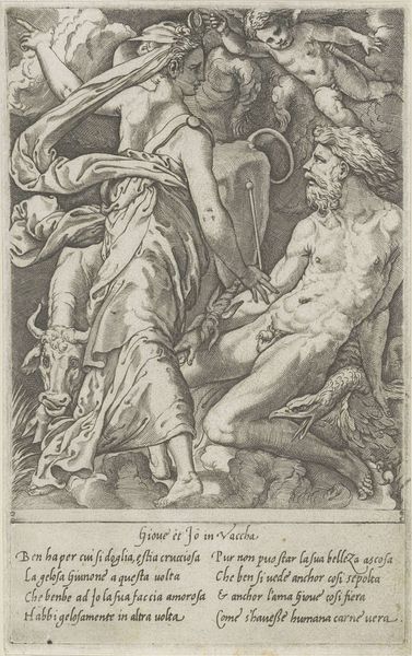 This print, "Profeet Jona," by an anonymous artist, employs engraving and etching to depict a biblical scene. These techniques involve using sharp tools to incise lines into a metal plate, which is then inked and pressed onto paper. The material quality of the print emphasizes line and texture, which in turn, define form. The engraved lines create a sense of depth and shadow, lending drama to the figure of Jonah and his celestial companions. Printmaking, in its essence, is a reproducible medium, democratizing art. Unlike unique paintings or sculptures, prints can be produced in multiples, making art accessible to a broader audience, regardless of class or status. Moreover, the skilled labor required for engraving and etching speaks to the socio-economic context of artistic production. It reflects the specialized skills and craftsmanship inherent in creating these images. Recognizing the labor and materials involved allows us to appreciate the cultural significance of this artwork, bridging the perceived gap between fine art and craft.