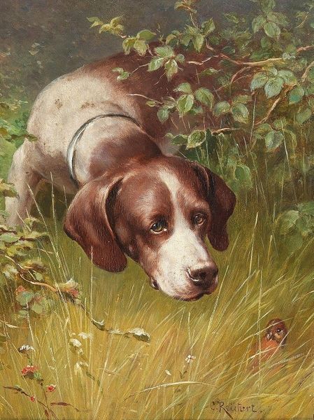 Carl Reichert painted this oil on canvas, titled "Gundog With Snipe," sometime between 1836 and 1918. The dog, a symbol of loyalty and hunting prowess, carries a snipe, representing the hunt's success. The motif of an animal carrying prey recurs throughout art history, from ancient Egyptian depictions of falcons with captured birds to classical Roman sculptures of hunting dogs. This portrayal taps into primal instincts, echoing the ancient hunter-gatherer relationship. The dog's gentle grip on the snipe reminds me of similar images in medieval tapestries where beasts protect their lords and emblems. Consider how the dog's unwavering gaze evokes a sense of duty. Perhaps this portrayal unconsciously touches upon our collective memory, reminding us of humanity's long-standing partnership with animals. Reichert's work, in its detailed realism, echoes themes of fidelity, service, and our enduring connection to the natural world. It's a timeless representation, continuously resurfacing in our visual culture, adapting to new contexts, yet retaining its primal essence.