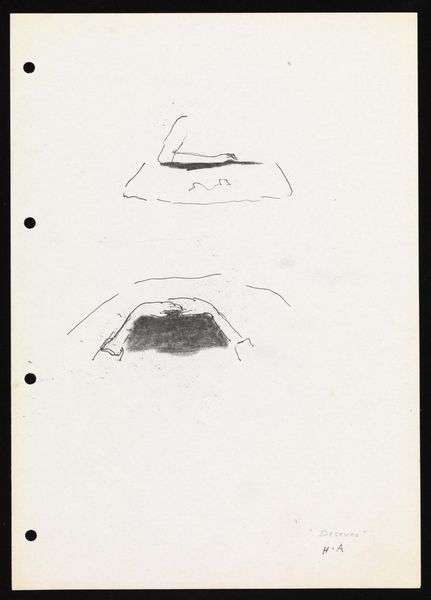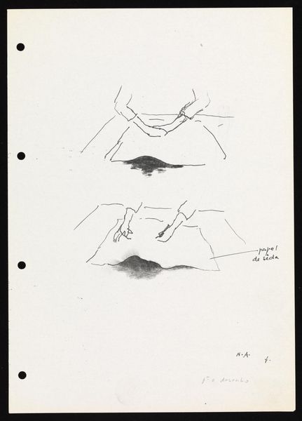 Curator: This is Helena Almeida's "Drawing (with pigment)", a work held here at the Tate. Editor: It strikes me as both fragile and strangely assertive. Those almost floating limbs, rendered so delicately, yet the pigment stains are so...emphatic. Curator: Almeida often explored the relationship between the body, space, and the artwork itself. The "drawing" blurs those boundaries. I see the support as another material to which Almeida is adding pigment. Editor: Right, the visible paper and the marks of production really show the performative aspect of drawing. It challenges our ideas of the finished product. Curator: I find it really captivating how she uses such simple means to evoke something so profound. Editor: Absolutely, it's a beautiful reminder that art can be about the act of creation, not just the final image.