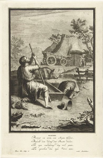 Editor: Okay, next up is “Kanonier en marketenster,” made around 1616 by Willem Pietersz Buytewech. It's an ink and pen drawing and etching here at the Rijksmuseum. I'm really drawn to the texture and the busyness of the composition, all these tiny detailed lines. It's a world teeming with life, somehow contained in this small picture! What catches your eye when you look at this piece? Curator: Oh, absolutely! It's a vibrant snapshot, isn't it? It makes me think about stories… what's *not* shown but hinted at, you know? The artist plays with the relationships…the soldier, the woman – are they friends, lovers, just passing acquaintances? It has the quality of a fleeting memory caught on paper! Look at how the smoke plumes contrast with the clean lines of the soldier’s figure! What do you make of the dog, so centrally placed, sniffing near the soldier’s exposed feet? Editor: Hmmm…that’s a great question. The dog feels grounded, real…whereas the two figures almost seem to float in their interactions. And yes! the exposed foot, a rather vulnerable point, protected only by the dog’s presence! It also reminds me that this is an era of expansion, of travel... Maybe the exposed foot signifies vulnerability amidst constant movement, and all of its accompanying dangers! Curator: Precisely! See, that’s the magic of it – the interplay, the suggested narrative. It reflects not just a single scene but a whole epoch brimming with discovery and potential dangers! It makes you consider individual vulnerability during an era of expansive exploration. Editor: I agree. Thinking about it this way has completely opened my eyes to the little details, it adds to the overarching story. I think this one will definitely stick with me! Curator: Wonderful, isn’t it, when a work reveals new depths? Makes me feel a little closer to the people in it, to the moment in history!