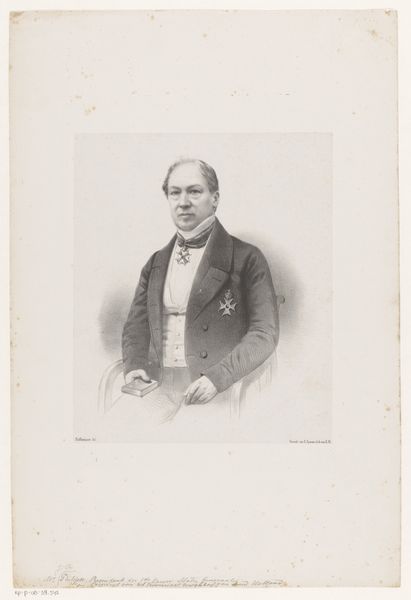 Curator: This is a print entitled "Portret van P. Jekel," dating from around 1851 to 1883, crafted by Johan Hendrik Hoffmeister. Editor: My first impression is of constrained elegance. The severe monochrome tones emphasize the formality of the subject, but I find the swirling lines used for shading and the detailed textures on the uniform give the composition an energy that tempers that sternness. Curator: Indeed. P. Jekel served as the Resident of Meester Cornelis, a position of high authority in the Dutch East Indies. Prints like these served an important function in visually representing authority and social hierarchies during that period. Reproducing an image and circulating it through printmaking served as a tool of empire. Editor: You see how the formal realism enhances his authority, particularly with its tight lines around the jaw? Also the stark contrast emphasizes the layered textures and patterns, drawing the eye. His stance, the grip on the hat, it all contributes to a composition that feels deliberate and self-assured. Curator: Portraits, disseminated through prints, were vital in forging a sense of connection between colonial administrators and the distant populations they governed. This wasn't just about aesthetics, but about solidifying the presence of the colonial administration. How power was represented mattered profoundly to social order and political control. Editor: Though I wonder, do the swirling details take away from the realism, in that sense? Maybe suggesting something softer under all the control you mention? Curator: That's a fine point, especially as the piece comes across as both a formal display and something that invites curiosity regarding the sitter. Editor: This contrast is precisely where I see the image resonating: not just as an instrument of power, but a point where authority meets something altogether more human, accessible even. Curator: Considering the history and formal elements together deepens our grasp on just how this art fulfilled various social functions at the time. Editor: A fascinating piece which reminds us to view each work of art not just for its beauty, but for its reflection of human aspiration and expression.