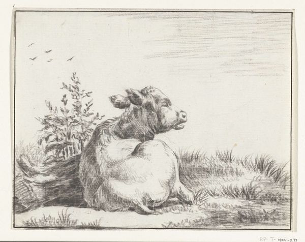 Editor: This is "Liggende koe, van achteren," or "Lying Cow, From Behind," a pencil drawing made around 1822 by Jean Bernard, currently residing at the Rijksmuseum. It has a certain…charm. Something about the casualness of the subject matter. What do you see in this unassuming little sketch? Curator: I see a window into the cultural relationship between humans and animals in the 19th century. Drawings like this weren't just about capturing likeness; they reflected societal values. The rising importance of agriculture at the time also placed the image of cattle into greater significance in both Dutch economy and social life. Think about how artistic depictions – even quick sketches – shape public perceptions. What role might the institutional support of art have played in that shaping, and how did art depicting "domestic" subjects contribute? Editor: So you are saying this isn’t simply a farmer doodling but a larger cultural and even economic story being told here? How so? Curator: Precisely. Images of livestock found their way into popular culture. Beyond mere depictions of "domestic animals" in art or everyday objects they spoke of productivity, rural life and, on occasion, a perceived harmony between humans and nature – even in a rapidly industrializing society. Consider the venues that would display or disseminate these kinds of drawings, and whose vision of this subject matter were they broadcasting to the larger public? Editor: Interesting! I never would have considered the sketch itself to be a part of any cultural argument. I will certainly have to rethink the function of works like these and the artist's purpose! Curator: Indeed. What appeared simple on the surface might reveal hidden intentions of social reflection when closely considered.