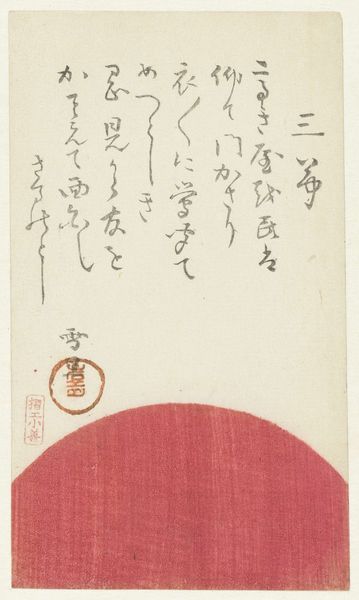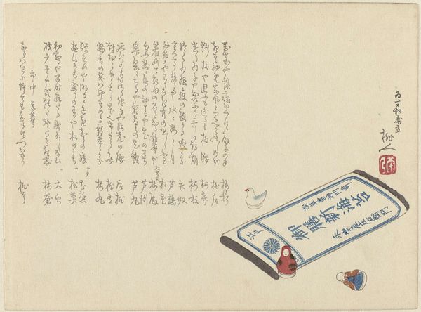 Editor: Here we have "Square Designs, Part One," a drawing by Kamisaka Sekka from around 1901-1902. It's watercolor and colored pencil on paper. I'm struck by the texture and color palette. It has a sort of fragility. What do you see in this piece? Curator: It is interesting that you use the term 'fragility' when what immediately strikes me is the piece's surface design and the contrasting blocks. How the linear elements, and particularly the calligraphy, interact with those simple geometric shapes is striking. Do you perceive those shapes contributing to the overall aesthetic? Editor: I do now that you mention it, the calligraphy does create a point of focus in the composition, an anchor of sorts. And I hadn't really thought about the interplay between line and shape. What about the waves? I noticed that too. Curator: Indeed. The stylized waves are interesting too, aren’t they? In semiotic terms, they are signifiers that function within a highly structured visual vocabulary. It’s interesting to observe the balance created between the representational, though highly stylized waves, and the more abstract shapes of the inscription label. How does this tension strike you? Editor: It gives the design a layered effect; a sense of visual depth despite the medium’s flatness. I guess I never stopped to consider what formal qualities might be at play, rather than getting caught up in the artist or history behind the work. Curator: Precisely. Appreciating how these elements converge unveils layers of artistic intention beyond mere representation. Editor: Okay, I think I have a better handle on this now, seeing it through the lens of pure visual relationships. Thanks for walking me through your approach. Curator: My pleasure. Remember, close observation will unlock so much about any artwork.