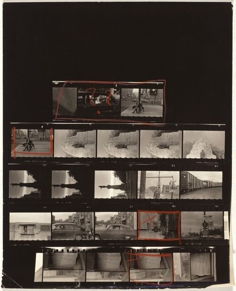 This is Robert Frank’s “Flowers on Cadillac hearse--Early New York City 3,” a photogram, so no date. It looks like a selection of frames from a roll of film with a few frames circled in orange. For me, it's about the process of selecting images. The texture of the film is so beautiful, I mean, the grainy quality of the black and white, the way the light and shadow play across each frame. The circled frames invite us to look closer, to consider what caught Frank's eye. It's like he’s saying, "Hey, pay attention to this," but also, "Why this?". The frame on the second row, the hearse, I love that we are peering into the window. Does this relate to Frank's interest in mortality? I wonder if Rauschenberg, a contemporary, saw this, and what he might have made of it. Ultimately, it's a reminder that art is always an ongoing dialogue, an open-ended conversation.
