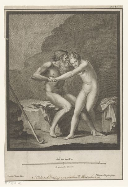 Editor: We’re looking at “Venus en Cupido,” or Venus and Cupid, a charcoal drawing from 1766. It’s currently held here at the Rijksmuseum. What strikes me is how muscular Venus is, and yet she still conveys a softness. What do you see in this piece? Curator: Oh, it’s delicious, isn’t it? Not what one expects. That strength combined with such tenderness. It makes me wonder about the expectations we place on, well, everyone. You know, "be strong but vulnerable," or "be independent but need me." Venus is looking down, is it concern? Protection? Is she showing Cupid how to wield his power responsibly? He’s tugging on the drape, isn't he? Editor: Yes, he definitely seems to have her attention, and you're right, the drape does seem central to the scene. The distant architecture is very interesting too. Curator: Ah, yes! Another contrast, the domestic idyll framed by the wildness. But tell me, does her seeming ambivalence detract from her divinity for you? Or does it add another layer of accessibility? Make her more, dare I say, human? Editor: It’s compelling to see Venus depicted in such an accessible way. It challenges the idea of distant, unattainable goddesses. I never thought of that distant architecture as framing an “idyll” at first. That really informs the rest of it! Curator: Exactly! See? The magic isn't just in the charcoal, but in what it stirs in us. Now I'm seeing all kinds of possibilities that were obscured by initial perceptions!