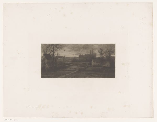 Editor: This is "Landscape with a Farmhouse by a Stream" by H. van Meerbeeck, dating from somewhere between 1850 and 1913. It's an etching, and there’s something very serene, almost melancholy, about the way the light falls. What's your take on it? Curator: Well, considering the time, let’s think about Realism and its relationship to industrialization. How does the choice of representing rural scenes relate to the socio-political context of the late 19th century? Do you think there is an element of resistance to modernity present in the scene? Editor: I hadn't thought about it that way, but I can see how a seemingly simple landscape could actually be a statement. Perhaps it is romanticizing rural life in the face of increasing urbanization. Curator: Precisely! And we need to also think about the market for art at this time. Who was buying these kinds of images? The rising middle class often yearned for connection to nature. Also, how does the medium of etching contribute? Was printmaking enabling a wider audience to own art and engage in a form of political messaging? Editor: That makes sense. So, the very act of creating and distributing these prints democratized art in a way, making it accessible to more than just the elite. It wasn't just about showing a pretty picture, but also making art part of everyday life. Curator: Absolutely. Museums at that time played a pivotal role, by shaping the public’s view of this form of art. Editor: That’s fascinating! I’ll never look at a landscape print the same way again. Thank you for making me think so critically about the artwork's social life and the way it becomes relevant through art institutions. Curator: My pleasure. Thinking about art as part of history changes how we view our modern society.