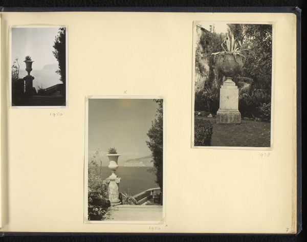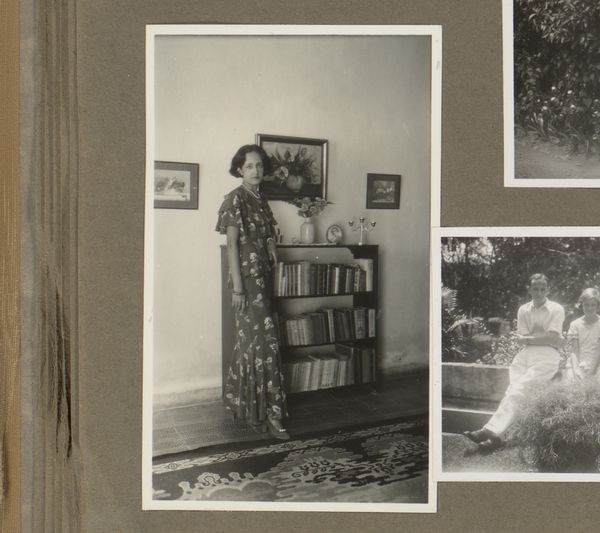 Editor: This is a gelatin-silver print from 1933 entitled "Dootje van Zijll de Jong met Bobby en een man in een park, Batavia." The formality of the subjects in the landscape is striking. What are your initial thoughts looking at this? Curator: Ah, a family snapshot, seemingly frozen in time yet brimming with untold stories. For me, the composition—the figures poised on those steps—it almost feels like they are performing for the camera, or perhaps staging a tableau vivant. The sharp contrast between the formality of their attire and the wildness of the park also captures something of the Dutch colonial experience in Batavia, modern faces amid paradise, what do you think? Editor: That’s interesting. I didn’t think of it as a performance, but I can see how the careful staging and formal attire contribute to that impression. What else strikes you about the image? Curator: Beyond the immediate visual, there's an undercurrent of something… missing. Are they happy? Pensive? The image feels oddly staged, leaving one to question the ‘true’ story. Almost like life’s stage captured in a single, monochrome moment. It reminds me, in a strange way, of the silent era of cinema; moments ripe with emotions and possible scripts written beyond the captured shot. Don't you think the composition guides the eye and plants questions in the mind? Editor: Definitely, now that you point it out. It’s less a casual family portrait and more a curated representation, making it all the more intriguing. I'm starting to see the multiple layers contained within this photograph! Curator: Precisely. It transcends a mere documentation; it becomes a cultural artifact laden with unspoken narratives, like whispers from the past resonating within the photographic emulsion. It invites us to create the unwritten story that transcends history. Editor: Well, that’s certainly given me a fresh perspective on the image. Thanks so much!