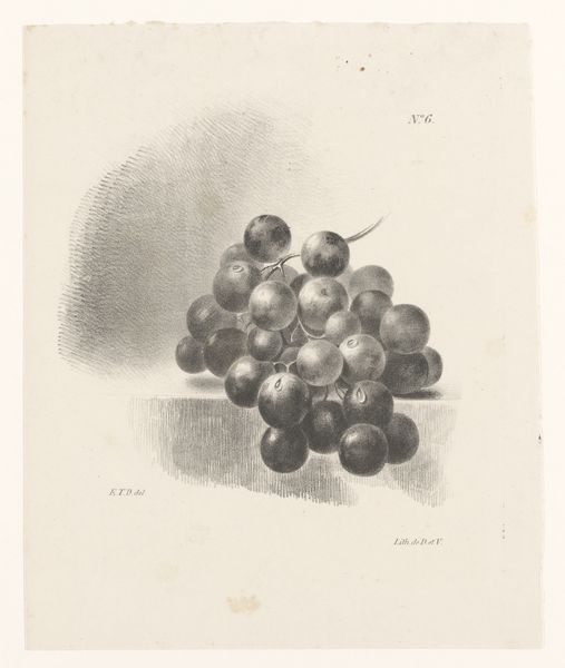Curator: Welcome. We’re standing before “Druiventros,” a drawing made with pencil and colored pencil on paper, sometime between 1820 and 1833. The artist, Anton Weiss, is less well-known today, but this botanical study is a fine example of his skill. It's currently held here at the Rijksmuseum. Editor: First impression? It feels…weighted. Those grapes are heavy, dense, and rendered with such somber precision. It’s beautiful, but melancholic, somehow. Almost like a memento mori, but in fruit form. Curator: Indeed, the grapes do hang quite heavily, don’t they? In Christian iconography, grapes, like wine, are symbolic of the blood of Christ. It’s often a signifier of sacrifice, and, of course, communion and spiritual nourishment. Here, though, I see more of a straightforward botanical study. A careful examination of nature. Editor: Oh, absolutely. I don't want to impose meaning where it isn't intended, but isn’t it fascinating how readily those symbols surface? Even in what seems to be objective observation. That subdued color palette—greys, muted greens, touches of faded violet—it strengthens that feeling, you know? It doesn’t pop like a sunny still life; it breathes quiet reflection. Curator: Weiss's meticulous attention to detail also conveys meaning, especially around ephemerality. Consider how carefully he’s rendered the leaves, showing subtle decay near the edges, indicating time passing, the life cycle continuing. He captures nature, but suggests also it's fading, fragile quality. Editor: Like capturing a memory fading…beautifully preserved in graphite and faint color. This single cluster of grapes carries so much… It really highlights the power of observation, and how even something simple can resonate on multiple levels. You've given me a whole new way of thinking about simple art, the cultural context. Curator: And your insight reminds me how powerful these symbols become with subjective impression! We imbue our lives and memories into every sign. The personal and historical blend! Editor: Well, let's go find our next reminder. What wonders will we unpack now?