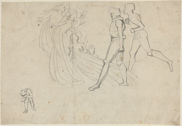 Editor: Here we have Antoon Derkinderen's drawing, "Jakob worstelend met de engel", created sometime between 1869 and 1925, using pencil on paper. It’s a quick sketch, capturing the tension of the biblical struggle. What do you see in this piece, focusing on its artistic form? Curator: Observe the economy of line, how Derkinderen uses minimal strokes to define form and suggest movement. The composition, while seemingly spontaneous, is carefully arranged to convey the physical and perhaps spiritual struggle. Consider the angel's wings – see how they frame the combatants, adding to the drama. The contrasting densities of line work are very informative; notice how it is denser in the bodies that wrestle to signify mass. Editor: It is compelling. The looser rendering of the other figure leads me to wonder, does this indicate that they are ghosts, spectres, or the imaginings of the main figures? Curator: A crucial question! We must attend to what is visible in the drawing. Consider what it means for something to be spectral. Here it might just as well mean that that figures are far in the distance or that it is drawn using far less pencil and therefore less defined. In this formal approach, it’s productive to analyze how the structural components affect one another and, in this case, how the comparative qualities impact each figure's presence in the overall work. Editor: That’s a really helpful perspective, to bracket those interpretative assumptions and instead engage with the formal qualities as evidence of the artistic process. Thanks! Curator: You're welcome! A formalist approach provides invaluable tools to analyze artwork on the merits of its visual features.