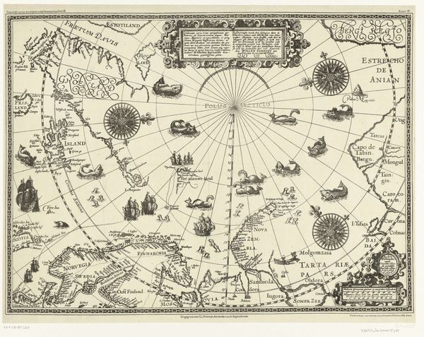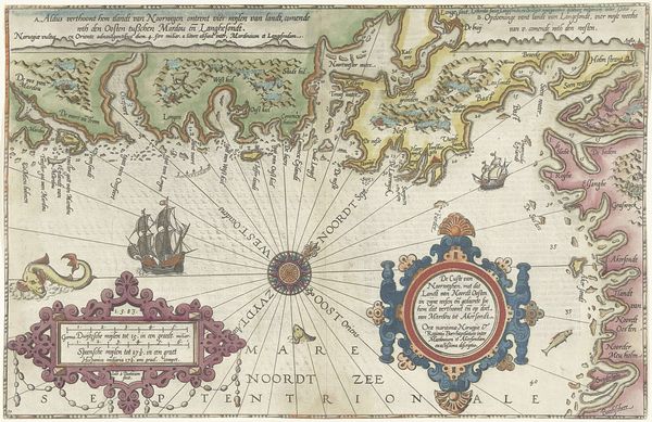 Curator: Ah, "Kaart een deel van de kust van Noorwegen en Zweden"—a map of a section of the Norwegian and Swedish coast, made between 1580 and 1583 by Joannes van (I) Doetechum. It's a riot of lines and labels. What strikes you initially about it? Editor: Well, the details! It feels a bit overwhelming at first, but then I get drawn into the ships and sea monsters. I'm curious, though; it's both functional and ornate. How do you interpret this blend? Curator: Exactly! It’s a working document, but it’s also intended to impress. The cartographer is not just conveying information; he's creating a symbol of power and knowledge. Think of the ships sailing bravely into the unknown – a visual representation of Dutch maritime dominance. Notice the compass rose—isn’t it stunning? Editor: Definitely. I guess I hadn’t considered it as a statement of power, more just a way to understand the world better. Curator: And that *is* part of it. These maps gave people a sense of control, of being able to tame the wildness of the seas and claim it for themselves. The sea monsters also hinted at danger, adding excitement. Do you see any symbolism elsewhere? Editor: The text boxes with their ornate frames look pretty grand. Is that further highlighting its status? Curator: Absolutely. And consider the coloring: reserved but clearly meant to make this more than just ink on paper. So, in the end, what does the map tell us beyond geographical details? Editor: I see now. It’s a Renaissance snapshot – science mingling with art, function embracing symbolism. It gives you a different perspective than just reading facts. Curator: Precisely! These aren’t just lines on paper. They are whispers from the past.