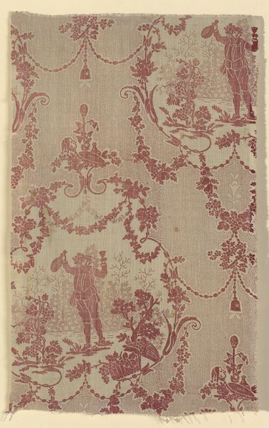This textile piece was made at the Oberkampf Manufactory in France, sometime between 1760 and 1843. It's printed with a pastoral scene in red dye. The idyllic imagery speaks to a cultural fascination with rural life that was popular among the French aristocracy. These images, though, were far removed from the realities of peasant life. The print also demonstrates the institutional power of the textile industry during this period. Manufactories like Oberkampf were major economic players, employing thousands and shaping fashion trends. The visual codes used here – the idealized figures, the carefully arranged flora – project a vision of harmony and plenty, subtly reinforcing the status quo. Understanding this piece requires us to look beyond its surface beauty. We must delve into the social and economic conditions of its creation, using historical records and critical analysis to uncover the complex meanings embedded within the fabric.