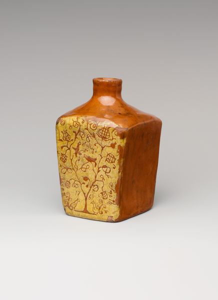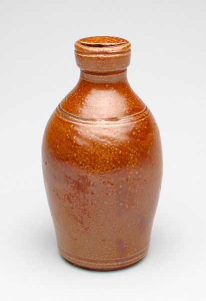 Editor: Here we have the "Jug still bank," a ceramic folk art piece made around 1880. It's quaint, and I'm drawn to how… sturdy it looks. Like it was built to last! The color is lovely as well. I would describe it as a muted rustic brick red, which works very well with the piece being what looks like a home-made vessel. What story do you think it tells? Curator: Well, doesn’t it just shout out "homemade practicality meets a playful urge to save"? I picture a family carefully crafting this stoneware jug, then firing it up with such a bold color, right in their backyard kiln, maybe while a hound dog naps nearby. Then they had a genius moment—cutting a coin slot! It's simple but profound, linking resourcefulness with the slow build of security. Did this bank hold dreams or just pennies, I wonder? It certainly feels warm and inviting. Like coming home. Don’t you agree? Editor: Definitely. I didn’t think of the backyard kiln… the kind of grit that this artwork embodies. This is miles away from an industrial-style product of that same era, say, from the Wedgwood factory. It's more personal and feels more deeply connected with the makers. Curator: Exactly! It bypasses cold perfection. It’s flawed, beautifully imperfect. It’s full of a tactile soulfulness. Did you also notice that rustic charm it exudes, blending into a seamless and utilitarian stoneware shape? This also evokes themes of self-sufficiency and folksy ingenuity from the time, making it such an amazing little bank with an incredible personality. Editor: It's remarkable how a seemingly simple object like this bank can hold so much historical and emotional resonance. I would like to learn more! Thank you! Curator: Indeed! It’s always a thrill peeling back layers to reveal a heart brimming with human stories and echoes. These humble relics help us hear what still needs hearing.