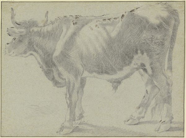 This is a drawing of a cow by Francesco Londonio, made with chalk on paper. The most striking aspect is the softness achieved through Londonio's handling of the chalk. The texture of the cow’s fur seems palpable, a direct result of short, rhythmic strokes that build up the animal’s form. Consider how Londonio challenges the traditional hierarchy of genres by focusing on an animal study with such care. The cow is not merely an element in a landscape or a symbol within a larger composition; it is the subject itself. Semiotically, this elevates the status of the animal, disrupting conventional artistic values. The monochromatic palette further reinforces the drawing's formal qualities. The subtle gradations of tone create depth and volume, underscoring the artist's mastery of light and shadow. This cow, rendered with such sensitivity, invites ongoing interpretation about our relationship with the natural world.