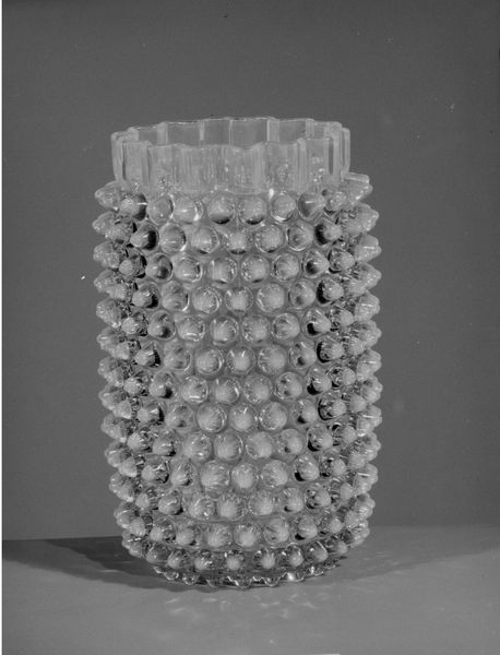 Editor: This is the "Hobnail Fruit Bowl," made sometime between 1887 and 1896 by Hobbs, Brockunier and Company. It’s glass, and all those little raised bumps make it look like…well, hobnails! What’s fascinating is that this elaborate piece was actually meant for everyday use. What jumps out at you? Curator: What interests me is understanding the social and economic conditions that allowed for the creation and consumption of an object like this. How accessible was something like this bowl to the average household at the time? We often overlook how glass-making, even then, was an industry driven by both skilled labor and industrialized processes. Editor: That's an interesting point. It's beautiful, but I hadn't considered its context in terms of labor. So, you're suggesting the bowl represents the intersection of industry and artistic craftsmanship? Curator: Precisely! The meticulous detailing, the hobnail pattern itself, speaks to a specific technology and level of production. The materials, where did they source the glass, what chemicals give it that hue? Those things matter as much as the design. It prompts us to think about who made it, in what conditions, and who ultimately purchased and used it. It wasn't "art" in the high art sense; it was a commodity. Editor: So, appreciating this fruit bowl involves thinking about its place in the larger network of 19th-century American manufacturing and consumer culture, rather than just aesthetic appeal? Curator: Absolutely. By focusing on its material properties and the forces behind its production, we understand it as part of a broader economic and social landscape. Editor: I’ll never look at a glass bowl the same way! It’s amazing how much a seemingly simple object can reveal about its time. Curator: Indeed! Looking closely at materials always opens a wider view.