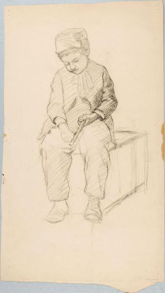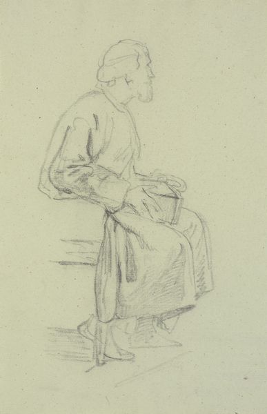 Editor: This is Charles Samuel Keene's "Self-Portrait, Seated," from the Tate Collections. It's a small pencil drawing that evokes a sense of quiet contemplation. What symbols do you recognize in the image? Curator: The pose itself is laden. The seated figure, head in hand, carries a weight of intellectual tradition, from depictions of melancholia to artistic genius. Notice the gaze averted, not engaging directly with the viewer. What does that suggest? Editor: Perhaps a detachment, or introspection? Curator: Precisely. Consider how the simplicity of the medium – pencil on paper – contributes. It evokes a sense of immediacy, of a fleeting moment captured. The chair, the clothing; these are all symbols of the everyday elevated to the level of art. Editor: I never thought of the everyday being symbolic. Curator: That's often where the most potent symbols reside. Keene shows us the profound in the ordinary. Editor: I'll keep that in mind when observing other works. Thank you.