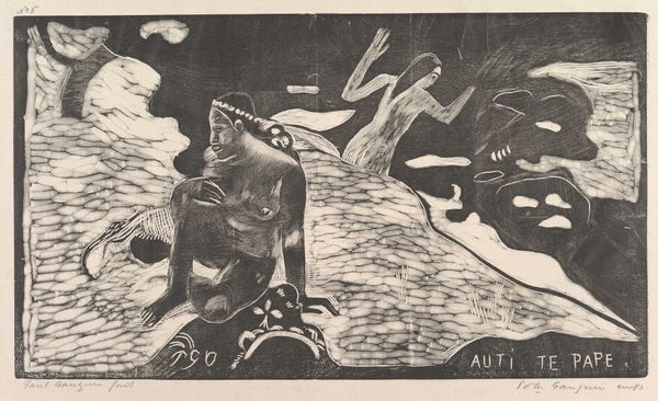 Curator: This is Paul Gauguin's "Auti te Pape," a striking woodcut and linocut print created between 1894 and 1895. Editor: The composition really grabs you, doesn't it? Such strong contrast between the yellow and dark tones; almost like a dreamscape. There's a real primal feel here. Curator: Indeed. Gauguin's use of contrasting colors, primarily those blocks of saturated yellows, serves to flatten the picture plane, eschewing traditional Western perspective for a more symbolic, evocative space. This deliberate distortion heightens the feeling of being transported. Editor: It’s compelling how the artist simplifies form to communicate deeper symbolic intent. These simplified shapes also amplify the composition's visual power and suggest a rejection of realism for expressing emotion. The choice to print in this style allowed Gauguin to spread these visions far and wide, not just to private collectors. It hints at his ambitions to impact broader society and to popularize Tahitian culture, though obviously through a colonial lens. Curator: Precisely. The formal breakdown of figure and ground pushes the work beyond pure representation. He uses this abstracted imagery to engage with questions about human origins, primal urges, and the relationship between humanity and the natural world. Also, the flatness emphasizes the artwork as an object in and of itself, forcing you to reckon with its inherent artificiality. Editor: And in that artificiality, or constructed image of Tahiti, there's power. The print is not simply a visual representation of Tahiti but a social tool, participating in a colonial discourse, whether Gauguin was consciously aware or not. The politics inherent in such images were, and are, hard to ignore. Gauguin appropriates elements of Tahitian life to build his exotic fantasies which circulate back to the society that he depicted and influenced it profoundly. Curator: Well said. Examining Gauguin's work can illuminate our understandings of modernity. Looking at these bold shapes reminds us that art need not replicate the real world but instead can operate in the realm of symbolism, influencing cultural perception as well. Editor: Considering these complexities certainly enriched my understanding. Gauguin was much more than just another artist; he was enmeshed within very relevant dialogues on history, colonialism, representation and interpretation of exotic cultures.