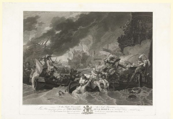 Louis Jean Desprez created this print of The Capture of Selinus by Hannibal, now at the Metropolitan Museum of Art. The monochromatic aquatint evokes a sense of chaos and destruction, achieved through intricate details and dramatic contrasts. The artist masterfully balances the composition between the dark, turbulent smoke in the upper register, and the frenetic activity of the ships and combatants below. The overall structure of the print relies on a semiotic interplay between light and shadow. Desprez uses the aquatint technique to create a range of tones, from the bright, almost ghostly appearance of the burning city to the dense, inky blacks of the naval vessels. The city of Selinus in flames can be read as an allegory for the transience of power and the futility of human endeavor. The architectural ruins hint at the collapse of established orders, resonating with contemporary philosophical discourse that questions fixed meanings and values. Note how the artist uses a limited palette to amplify the emotional impact. This stylistic choice emphasizes the underlying structure of the artwork, inviting the viewer to contemplate the shifting terrain of history, and the unstable nature of cultural memory.