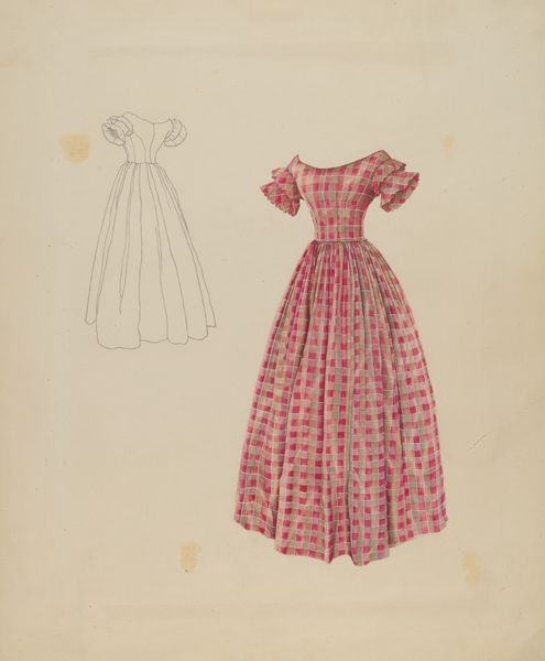 Editor: This is "Girl's Wrapper," a pencil drawing from around 1937 by James H.C. Vail. It looks like a design for a dressing gown. It feels very traditional to me, almost old-fashioned with the frills. What can you tell me about it? Curator: Well, immediately I’m struck by the intimacy suggested. It’s a garment designed for private moments, for the liminal space between waking and sleep. The stripes, rendered in what appears to be pencil, possess a domestic quality. But the collared neck gestures at a Victorian sense of modesty, doesn't it? Think of similar portraits depicting the vulnerability of childhood. Does it evoke a memory or feeling in you? Editor: I see what you mean. There is a protective feeling evoked by the high collar. The wrapper shape almost forms a column with only the frills on the sleeves hinting at youthful expression. Are there specific cultural or historical ideas at play here, considering the time it was made? Curator: Definitely. The 1930s were a period of economic hardship, yet there's a focus here on home life and a kind of carefully constructed presentation. It feels very self-contained. But notice too the use of stripes – do they remind you of anything? Perhaps traditional seaside wear? The blurring of public and private, beach and boudoir – it adds a curious tension. Editor: Yes, I do see the nautical link! I hadn’t thought of that before. The overall impression feels softer now. Curator: It's fascinating how seemingly simple designs carry layers of meaning, isn't it? And how we project our own memories onto them. Editor: Absolutely. I learned so much about how an everyday image holds many symbols if we observe carefully. Curator: Agreed, I was unaware of the seaside link. This has been quite illuminating.