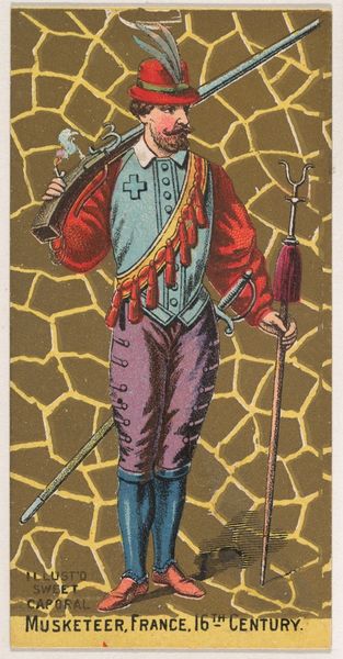 Curator: Here we have Josef Kriehuber's 1828 painting of "Sabolch, legendary Hungarian military leader." The portrait gives us an interesting window into 19th-century historical romanticism and ideas of national identity. Editor: It’s quite striking! The composition relies so heavily on contrasting colours - the bright blue coat against the yellow boots, for example - that it almost feels theatrical. Curator: Absolutely, that's Kriehuber playing with visual tropes to establish a heroic image. He’s depicting Sabolch, an almost mythical figure, as a symbol of Hungarian strength and historical continuity. Editor: I agree about that careful construction; every detail is quite deliberately placed to guide the viewer's eye around the figure and focus ultimately on the subject’s face. Curator: Consider the symbolism too – the figure's traditional Hungarian attire connects him to a powerful past, legitimizing contemporary nationalistic sentiments of the period. This wasn’t just portraiture; it was nation-building through imagery. Editor: But formally speaking, there's an interesting tension. Look how the folds of his white cloak create diagonal lines which are in sharp contrast with the straight vertical lines of his uniform and the central placement of the subject within the picture plane creating visual harmony... but I feel as though it contributes more of a static effect in which Sabolch seems captured more as symbol. Curator: The artist creates Sabolch as timeless embodiment of the nation and serves as an interesting intersection of romantic aesthetics and emergent nationalist ideology. Editor: Agreed, the colour scheme combined with the lines of the work create a work very rich with interesting form. But I also cannot deny, it feels...flat. It doesn't offer quite the perspective and tonal contrast I expect. It seems we should be considering some semiotic deconstruction if we really want to crack the code behind it. Curator: Exactly, which underscores how visual choices are never neutral. Each line, each color, they’re all contributing to the political narrative Kriehuber crafts here. It really highlights how the formal elements reinforce historical narratives. Editor: That definitely encourages us to look at historical events of the time and see how its themes interact! Thank you! Curator: My pleasure, these pieces encourage so much discovery, even now.