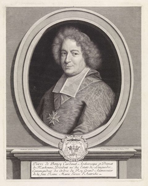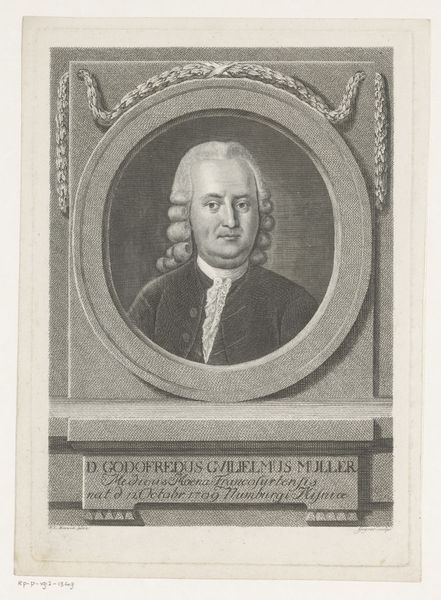 Editor: Here we have Johann Elias Haid’s 1778 engraving, "Portret van Johann Paul Reinhard," on paper. There's something about the formality of these older portraits that I always find a bit... stuffy, I guess? It's well-executed, but I can’t help but wonder about the story behind this particular professor. What do you see when you look at this engraving? Curator: Stuffy, you say? Perhaps. But within that supposed stuffiness, I sense a controlled vibrancy. It makes me consider the sitter's station in life. Here's a man presented within layers—an oval frame, set within a rectangular plaque bearing an inscription in Latin. Look closer, Editor. Who *was* Johann Paul Reinhard? Professor of History, it would appear. Editor: The text beneath the portrait certainly says that! Still, I feel there’s something missing. Curator: Consider the gaze. There's a directness, an intelligence there, isn't there? Haid's meticulous detailing hints at the professor's importance. Think of the late 18th century in Germany. There was the burgeoning Enlightenment and its impact on intellectual circles like the professor’s! Can you sense any of that represented here, beyond just a simple recording of his features? I would hazard that those seemingly fussy, intricate details of the lace and wig, the controlled pose, these elements subtly underline the Enlightenment's emphasis on order, reason, and scholarship. The inscription, in praising him for being good, wise and favored by Apollo, underlines just how crucial education was. Almost gives him the air of a slightly smug, but incredibly important scholar. What do *you* make of that, now? Editor: Well, putting it that way makes me see more than just “stuffy." He’s not just a face from the past; he represents something about the era, a moment in history… He has been, dare I say it, defluffed. Curator: Precisely! And isn’t it fascinating how a single piece of art can hold such depth once you begin to unpack its layers? A perfect little pocket-sized portrait, full of history and quiet revolution.