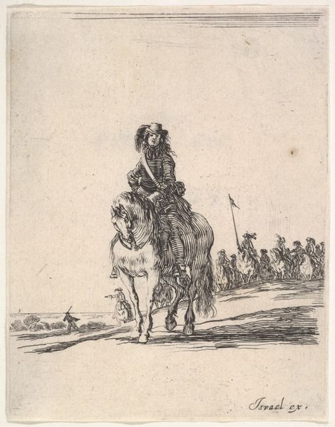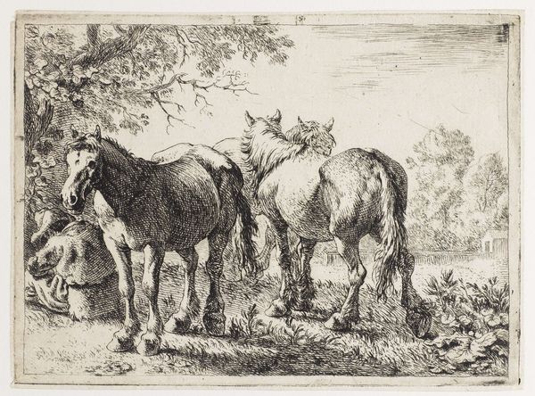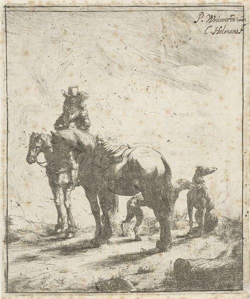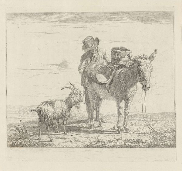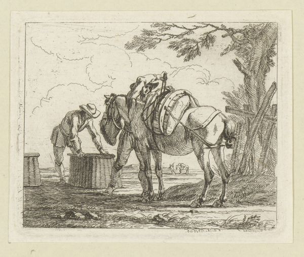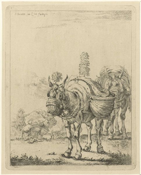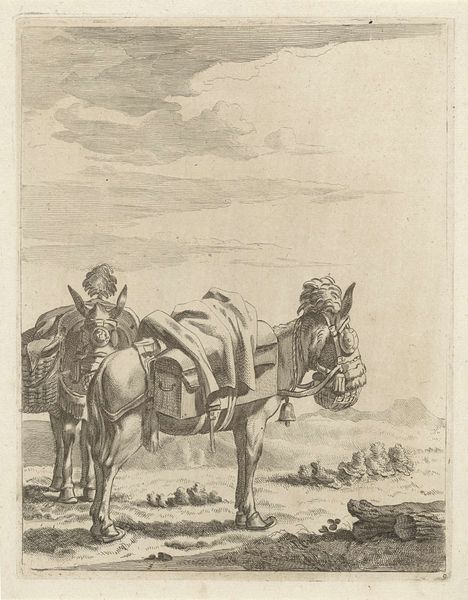 This etching, *Twee muilezels*, was created by Karel du Jardin, using black ink on paper. The composition centers on two heavily laden mules, their forms rendered through a dense network of fine, linear strokes. This technique creates a rich, textured surface that animates the scene with light and shadow. Du Jardin’s skill is evident in the way he uses line to describe form and volume. The repetitive marks build up the mass of the animals, giving them a palpable weight, while also suggesting movement through the variation in stroke direction and density. This visual language resonates with a broader semiotic system where labor and rural life were increasingly idealized. Consider how the structured use of line not only depicts the mules but also invites us to reflect on the interplay between nature and culture. The artwork functions as a site where meanings are constructed and negotiated, opening a dialogue about the values and representations of its time.