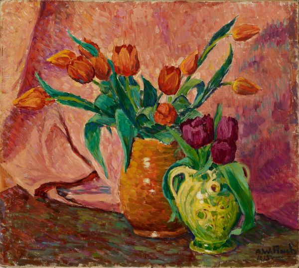 Curator: Here we have Henri Lebasque’s “Bouquet d’anémones,” an oil painting that vibrates with color. Editor: It feels instantly joyful. The hues are rich, the composition is informal; it almost has the immediacy of a sketch. Curator: Exactly! Lebasque's loose brushwork and bold palette firmly place the work within Post-Impressionist and Fauvist traditions. The layering of brushstrokes generates both texture and light. Consider how the composition guides our eyes: from the bright anemones to the shadowed box. Editor: It's more than just a visual exercise, though. Intimism is a major theme—the flowers, the jewelry box, the domestic setting... there's an unspoken narrative here, a private moment carefully composed. Curator: I agree. The painting offers a study in contrasts; rough impasto next to delicate floral forms. Consider how the vase grounds the composition, creating an axis, the relationship of that vase to the edge. It seems essential to the artwork. Editor: And that box - an open jewelry box, slightly askew! What’s inside? Who owned it? These intimate items hint at stories of gender, class, and perhaps privilege. A conversation about women's representation within the domestic space is invoked. Curator: Perhaps, but its power resides, I think, in its formal structure: in the relations between forms, colors and brushstrokes on a two-dimensional surface. How they resonate aesthetically. Editor: The aesthetic effect is undeniable, but it's enhanced by thinking critically about these sociohistorical elements that make us reflect about our world. These are the contexts of meaning production that form a connection with the viewer. Curator: Indeed. It is undeniable that this work remains a delightful exercise in expressive color and compositional strategy, a vibrant dialogue on art history. Editor: An evocative, colorful glimpse into a bygone era—a bouquet offered, still fresh and alive today.