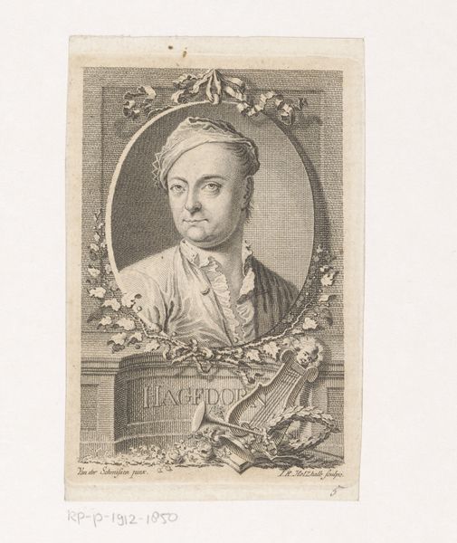 This print of Martin Gerbert was made by Aegid Verhelst, likely in Germany in the late 18th century. The oval portrait, framed by floral garlands, is a formal and idealized representation, fitting the conventions of the time for depicting prominent figures. Gerbert was a Benedictine monk, a prince-abbot of St. Blasien, and a significant figure in sacred music and theology. As such, his life was deeply embedded within the religious, intellectual, and political structures of the Holy Roman Empire. The print itself, while seemingly straightforward, participates in the visual culture of the church that supported and promoted its leaders. The garlands and musical instruments add to the ambiance. The Rijksmuseum's curatorial records and archives of the Benedictine order would provide more context. Understanding the relationship between religious institutions and artistic production helps reveal the complex interplay of power, patronage, and representation.