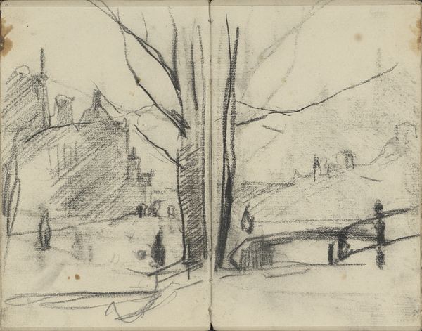 Editor: This is "Huis langs een weg bij Voorburg" by Louis Apol, created in 1880. It’s a pencil drawing, and there’s a quiet, almost melancholic feeling to it. What do you see in this piece beyond just a simple landscape? Curator: Beyond the immediate representation of a house along a road, I see an artist engaging with the changing landscape of the Netherlands. Apol, known for his winter scenes, here captures a more ambiguous season. Consider the social context: industrialization was rapidly transforming Dutch society, and artists like Apol grappled with depicting these changes. Does this scene portray a longing for a simpler, perhaps idealized, past? Editor: That's a compelling point about industrialization. The sparseness of the drawing does lend itself to that interpretation. Were artists actively choosing these kinds of subjects to reflect societal anxieties? Curator: Precisely! Landscape painting wasn't just about pretty pictures. It became a site where anxieties about modernity were negotiated. The road, usually a symbol of progress, here appears almost desolate, doesn’t it? Note the solitary lamppost, an early sign of urban encroachment on the rural landscape. Apol’s choices – his emphasis, or lack thereof – shape the narrative. How do you see this drawing fitting into the broader history of Dutch landscape art? Editor: I never really thought of landscape art as being that political. Thinking about it now, though, it makes perfect sense, especially during periods of rapid change. Thanks! Curator: Indeed! And this drawing offers a poignant window into how artists both reflected and shaped the cultural anxieties of their time. Food for thought!