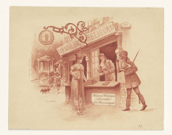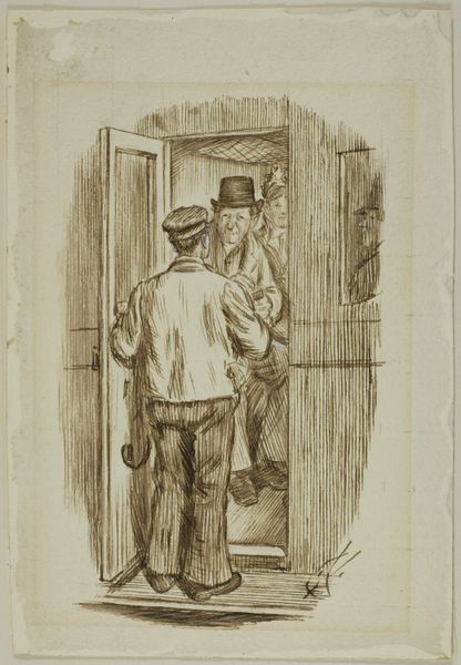 Curator: This spirited drawing, "Spoorweginspectie," or "Railway Inspection," comes to us from the hand of Patricq Kroon, sometime between 1920 and 1930. I am immediately struck by its animation, its palpable nervous energy. What’s your take? Editor: It feels like a loaded commentary. Look at the harried bureaucrat caged behind the window, versus the suited inspectors, one waggling his finger, the other wielding that absurdly large magnifying glass. There is a clear power dynamic at play. Curator: Indeed, Kroon employs strong diagonal lines, especially in the positioning of the figures and the cross-hatching behind the bureaucrat, which creates an imbalance, a sense of precariousness. The relatively confined space in which the sketch unfolds exacerbates that feeling. Editor: Absolutely, this imbalance likely alludes to the socio-economic tensions of the time. The magnifying glass almost mocks the worker's small world; are we supposed to inspect the inspectors as they oppress the working class? The title itself feels like a sarcastic remark about power. Curator: Intriguing perspective. I see a strong study in contrasts: light and shadow, angularity and curvature. Notice the rounded shapes of the bureau’s architectural details juxtaposed with the rigid lines of the railway inspector's clothing and stance. It generates a curious visual rhythm. Editor: These visual strategies highlight societal divisions. Note that although the piece ostensibly employs a realist style, it clearly serves a critical function. This image is charged, politically alert, hinting at a time where scrutiny often flowed downward, not upward. Curator: Well, the drawing serves as an intriguing synthesis of observation and, dare I say, perhaps a veiled commentary. A deceptively simple sketch that gives much to consider! Editor: Indeed. An apparently whimsical scene unfolds to expose the tensions inherent within any hierarchical system. Power imbalances made starkly manifest through Kroon's astute composition.