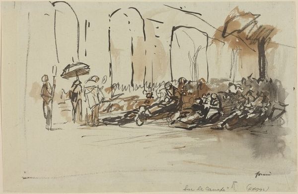 Curator: Welcome. Today, we’re looking at Maurice Prendergast’s "Outdoor Cafe," circa 1892, a watercolor capturing a fleeting moment. Editor: There's a spectral quality here; a hushed and slightly melancholic atmosphere pervades this plein-air sketch. It almost feels like looking at a faded memory. Curator: The overall composition hinges on delicate balance. Prendergast is employing what we might call a 'tapestry' effect with those distinct touches of color, carefully laid out on the rough watercolor paper. It establishes rhythm and guides the eye—it avoids any sort of deep space through layering of washes, creating this flattening effect and unique surface tension. Editor: Absolutely. That surface acts as a kind of membrane onto which images of public life are projected. The café scenes, often associated with vibrancy and social interaction, are muted in this work, as if symbolizing transient relationships. Look closely at how he rendered these flowers as they repeat like motifs. Do they not feel as emblems of fleeting beauty and pleasure? Curator: It's worth noting how Prendergast plays with transparency. The layering of these watercolor washes are barely built to constitute complete forms. Instead they hover, creating the ethereal mood we remarked upon. The lines are suggested more than delineated, especially the infrastructure: the tables. Editor: Agreed. There is that ghostlike quality and fragility that is central. What narratives do these scenes trigger in the collective imagination? Does it reflect the rise and fall of bohemian culture? Curator: One could suggest this piece prefigures elements that will mark much later work. Editor: I find myself dwelling on the symbol of transience itself. Curator: And I consider the beauty of incompleteness, and Prendergast’s revolutionary surface composition, and its legacy on abstraction.
