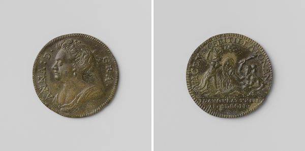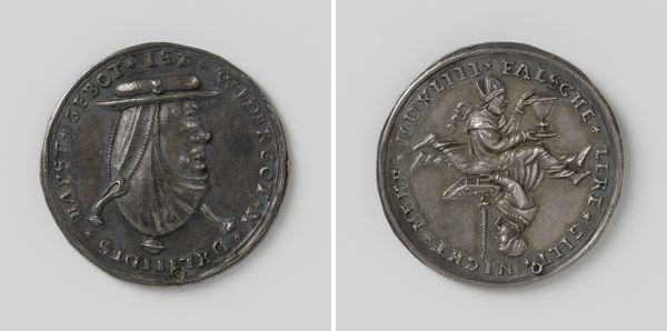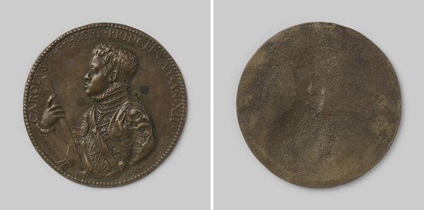 Curator: Here we have a striking piece dating back to 1614: a metalwork commemorating Johannes Richardot, Secretary of the Privy Council. What’s your initial impression? Editor: It's quite somber. The low relief, combined with the metal’s gray tone, gives it a muted, almost mournful quality. It definitely feels weighty. Curator: The weight is both literal, given its likely material, and figurative. Richardot was a key figure, navigating complex political landscapes. This medallion likely served not only as a commemorative object but also as a symbolic representation of his position and influence. Editor: The owl on the reverse is compelling. With knowledge of the era, can we confidently ascertain a correlation of the figure of the owl with secret knowledge and foresight, even? And there’s a draped figure to its right. The whole thing has the air of a private allegory. Curator: Exactly. The owl was indeed a symbol of wisdom and vigilance, befitting a man entrusted with secrets of the state. The draped figure… it's a little harder to pin down, but could represent Prudence, a classical virtue essential for any successful statesman. It suggests someone considered a careful guardian. Editor: Given its date, it stands between two eras; a foot in the Medieval, a reach towards what comes next. One sees some classicism perhaps, but weighed down by grimier circumstances. The imagery gives the effect of a kind of personal branding—certainly more highbrow and laced with a deliberate attempt at visual messaging, though. Curator: It’s a fascinating artifact that opens a window into the intersection of personal identity, political power, and symbolic language in the early 17th century. A memento designed not only to remember a man but to project a carefully constructed image of him, too. Editor: Indeed. Medallions such as this really compress historical and cultural data. Examining it helps one begin to understand that time period. Curator: It serves as a stark reminder of how the construction and manipulation of images are crucial to shaping both individual reputations and historical narratives, doesn't it?