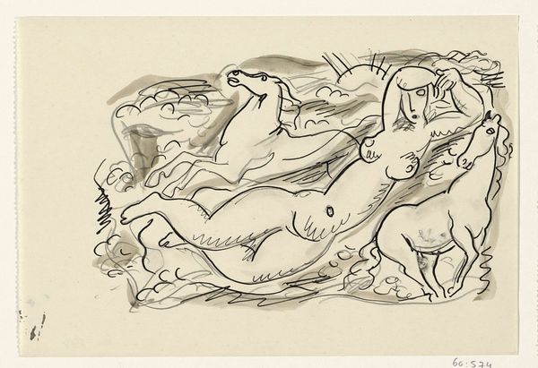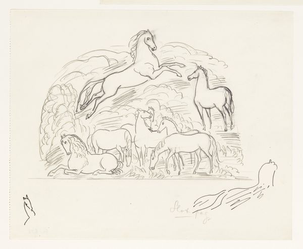 Editor: This is "Studieblad met paard en drie zeemeeuwen," or "Study Sheet with Horse and Three Seagulls" by Leo Gestel, likely made between 1891 and 1941. It’s a graphite drawing on paper, housed here at the Rijksmuseum. The light and airy lines give it a sense of dreamlike motion. What strikes you about its composition? Curator: The immediate impression is of dynamic tension created through the interaction of forms. The horse, rendered with a seeming spontaneity of line, is juxtaposed against the more static presence of the seagulls. The diagonal orientation further emphasizes this sense of movement, drawing the eye across the plane. Observe how the artist uses line weight; heavier contours define the horse's musculature, while delicate, almost ephemeral lines suggest the lightness of the birds. Editor: I see what you mean about the contrast. It’s almost like two separate studies combined into one. Is there a hierarchy in the drawing, in your opinion? Curator: The hierarchy is definitely constructed through form and placement. The horse, being the larger and more detailed figure, commands visual dominance. Note how the artist frames the composition with implied horizon at the bottom and subtle cloud-like masses. Gestel invites us to consider relationships between form and emptiness and their effects. Editor: That's interesting, focusing on the interplay itself, rather than narrative. So, rather than imagining what this scene might represent, you see it as Gestel exploring the effects of particular formal techniques. Curator: Precisely. The power resides not in illustrative storytelling, but in how the formal elements communicate independently. It underscores a fascinating interplay between intention and result within a focused investigation. Editor: I never considered that level of pure form! I’m beginning to understand how the shapes and their interaction become the story. Thanks for shedding light on it.