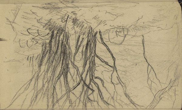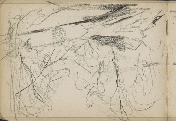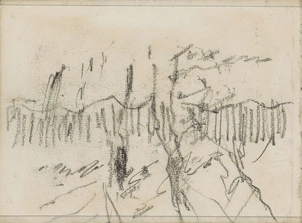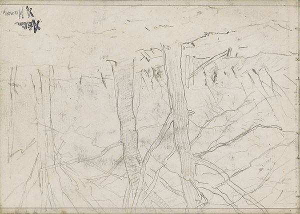 Anton Mauve created this drawing, "Bomengroep in een landschap," with a graphite pencil on paper. The composition presents a landscape dominated by a cluster of trees. Notice how Mauve employs a series of vertical lines to depict the trees, contrasting them with the more loosely defined, horizontal strokes that suggest the sky and landscape. The density of the lines creates a sense of depth. The subtle tonal variations achieved through the graphite lend a soft, almost dreamlike quality to the scene. The rough and unfinished quality destabilizes traditional landscape art. Mauve invites us to reconsider our relationship with nature and representation. Rather than offering a polished, idealized view, this drawing reflects on the intimate exchange between the artist and his subject.