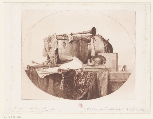Curator: This striking albumen print, titled "Relics of Andersonville Prison," was created in 1866 by Brady & Co. Editor: My first impression is one of profound melancholy. The muted tones and the carefully arranged objects evoke a sense of loss and the attempt to piece together fragmented memories. Curator: It's interesting how Brady, known for Civil War photography, shifted here to still life to address a social and political catastrophe. It highlights how such imagery served in the post-war period as public memorial and accusation. Editor: Indeed, note the choice of items presented: eating utensils, plates, small buckets… everyday items signifying basic human needs deliberately withheld. We understand Brady is calling attention to the deprivation and intentionality behind the prisoner of war camp’s horrendous conditions. It serves a form of visual rhetoric. Curator: And the labor involved in crafting such a staged photograph must be acknowledged too, not just Brady's artistry. Each object selected, arranged, and then photographed emphasizes the conscious decision to monumentalize these items and by extension, the experiences they represent. Note also how an object labelled 'Andersonville Dead Line' dominates the image... Editor: The material condition of those objects must tell a story about available resources within the prison and the trade networks inmates had to set up, which can bring new layers to interpreting this history... But can this singular depiction offer justice to those historical realities? To what extent does it reinforce rather than question certain public narratives? Curator: Perhaps, but what's significant is the artwork’s cultural capital today as part of institutions like the Met – it solidifies how social memory is both made and challenged, prompting questions of institutional responsibility. Editor: True. The object’s historical placement is as crucial as what the piece intends to convey. A really sobering yet thought-provoking work overall. Curator: Precisely. Its lasting value comes from provoking critical thought about history, materiality, and collective memory, which prompts reflection long after the viewing experience ends.