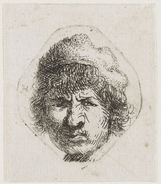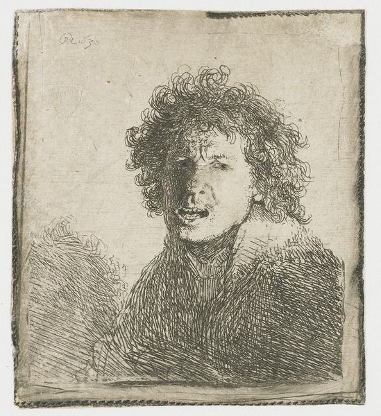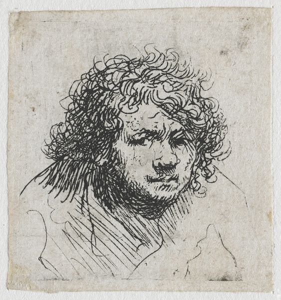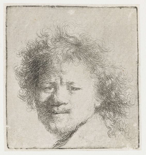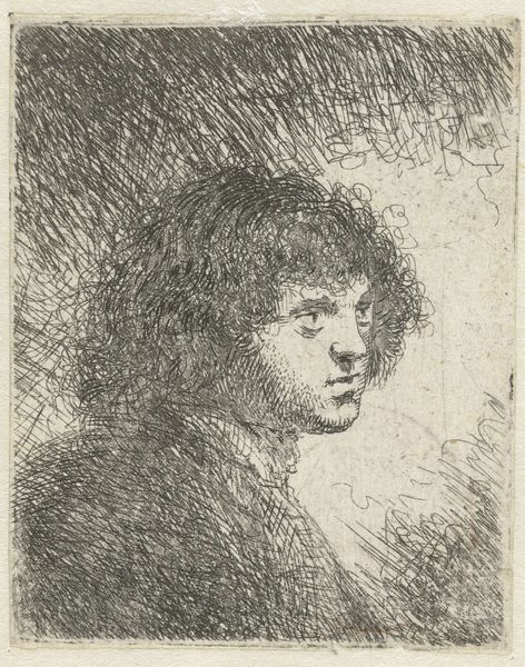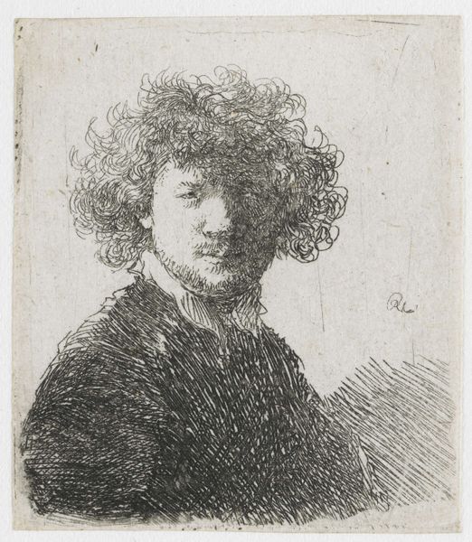 Rembrandt van Rijn created this self-portrait using etching, a printmaking technique with a long history. The process involves coating a metal plate with a waxy, acid-resistant substance, and then using a needle to draw an image, exposing the metal beneath. The plate is then immersed in acid, which bites into the exposed lines. The depth of the lines corresponds to the time spent in the acid bath, allowing for subtle gradations of tone. When printed, the etched lines hold ink, creating the image on paper. Look closely at the density and direction of the lines, they define Rembrandt’s features and swirling hair, conveying a sense of depth and texture. Etching allowed artists to produce multiple copies of their work, making art more accessible to a wider audience, and feeding the burgeoning art market. The technique requires skilled labor, both in the artist's hand and in the printing process, reflective of the increasing specialization of labor in the 17th century. Considering the material and the making enriches our understanding of Rembrandt's self-portrait, highlighting the intersection of artistic expression, technical skill, and economic factors.