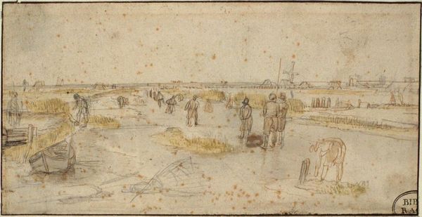 Editor: This drawing, called "Winter Landscape with many Figures and Sleds, in the front lies a dead Horse, eaten by Ravens", is attributed to Hendrick Avercamp, and is rendered in ink, chalk and watercolour. Despite all the activity, I feel an overwhelming sense of stillness and, well, bleakness. What draws your eye when you look at it? Curator: The most arresting element, of course, is the stark image of mortality in the foreground. That dead horse, beset by carrion birds, it's not merely a detail. It's a "memento mori", a potent symbol reminding us of life's fragility. Editor: That’s a very heavy contrast to the skaters, the sleds, the bustling activity... almost a brutal juxtaposition. Curator: Exactly! Avercamp does not shy from contrasts. Look how deftly he captures the figures – each tiny individual rendered with care. But these figures are all dwarfed by the vast expanse of the winter landscape. How do you think that scale impacts the way we see the painting? Editor: I think it kind of reinforces a sense of smallness. And vulnerability. Curator: Precisely. Winter, then, becomes not just a season, but a metaphor – a representation of hardship and endurance. Look at how the people work together, seemingly to defy the elements… a visual elegy of social resilience, right? Editor: Yes, that’s helpful. So even though death is depicted, the living community finds a way forward? Curator: Indeed. Avercamp weaves life and death, leisure and labor, into a unified tapestry of the human condition, inviting reflection of not only our lives but on those in centuries past. Editor: Seeing the symbology offers another dimension to this landscape – more than just a slice of life from long ago. Thanks!