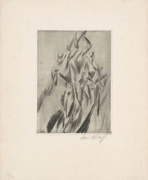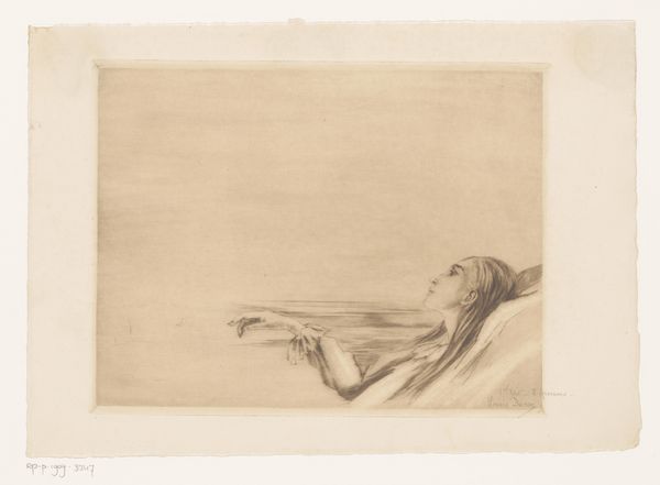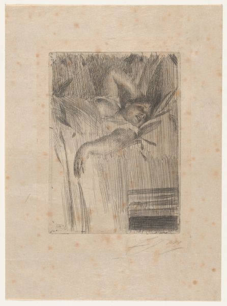 Curator: Here we have "Le Réveil," or "The Awakening," an etching by Anders Zorn, created in 1891. It's currently housed here at the Art Institute of Chicago. Editor: The first thing that strikes me is the fragility, the vulnerability of the subject. It's like capturing a fleeting moment between sleep and consciousness. The delicate lines enhance that sense of transience. Curator: Zorn was indeed fascinated by capturing the intimacy of daily life. We see the reclining figure here, a nude, rendered in a flurry of etched lines. Given the context of 19th-century art and the male gaze, how might we understand Zorn’s representation of the female form in this print? Editor: It's definitely a charged topic. Is it exploitative? Maybe. But I also see a certain… tenderness? There's a quietness about the pose, an unposed quality, that sets it apart from the more theatrical nudes we often see. Plus, there's an androgynous quality to the figure. Curator: The interplay of light and shadow, achieved through the etching technique, adds depth and texture to the work, don't you think? The figure emerges from a dark background, emphasizing their form and the softness of the bedding. Also the direct address between figure and viewer cannot be discounted, even within the traditional framework of 'nude' portraiture. Editor: Absolutely. The way the light catches on her arm, the subtle curve of her back… it's gorgeous. It makes me think about my own sleep-fogged mornings, that hazy transition into wakefulness. It makes this artwork very immediate. Curator: It's interesting how Zorn captures this tension between public and private. Etchings like these were often made with an audience in mind, distributed and collected, so even the most intimate scenes enter the public sphere. Editor: That tension is what makes it captivating. The title "Le Réveil" – "The Awakening" – makes me consider what other sorts of awakenings Zorn was pointing to? The individual awakening, but maybe also social or intellectual? A sense of impending change and discovery feels inherent to this artwork. Curator: Very astute. "Le Réveil," through its technical mastery and thoughtful composition, invites us to consider the complex dynamics of intimacy, representation, and the subtle, powerful moments that define the human experience. Editor: Yeah, it definitely gives you something to mull over, doesn't it? Makes me want to grab another coffee and ponder the mysteries of being alive.