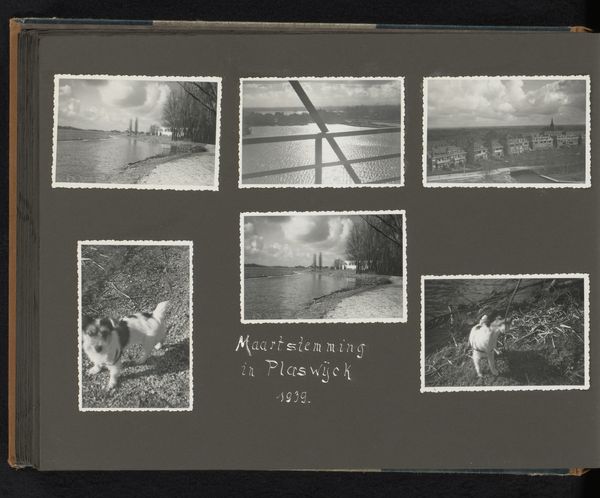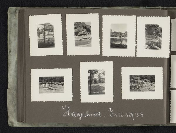 Editor: This is "Bruggen," a gelatin-silver print album page created around 1938-1939. What strikes me is how the images, documenting bridge construction in what looks like a verdant landscape, are juxtaposed against the album page. There is a sense of intimacy despite the rather grand scope of civil engineering, something that seems contradictory to me. How do you interpret this work? Curator: I see it as a potent visual commentary on the intersection of colonialism, industrialization, and the reshaping of landscapes. Photography here isn't merely documentation, but becomes a tool to both showcase progress and subtly reveal the impact of such interventions. The album format underscores a personal perspective, perhaps even a colonial gaze, observing and categorizing this transformation. Editor: So, you’re saying that the album format adds to the understanding of the image? Curator: Precisely. The deliberate arrangement of the prints, with handwritten notes like “Op weg naar Todjamboe” and "Bolohan", suggests a narrative. It invites us to question the power dynamics at play. Who is “on the way,” and who is being bridged, or perhaps, bridged over? We can examine how construction projects like bridges often served colonial interests. How they facilitate the extraction of resources and the control of territories and populations. Editor: I never considered the political subtext. I was just thinking of how beautiful the landscape seemed, and how the bridges fit right in with it. Curator: Exactly! That inherent tension between the aesthetic appreciation and the underlying socio-political reality is key. What responsibility, if any, do we, as viewers, have to question such images when observing work produced under colonialism? Editor: I learned a lot! I’m beginning to see photography in a whole new light. Curator: And that’s precisely the goal – to encourage critical engagement with art beyond the purely visual, acknowledging the multifaceted narratives embedded within.
