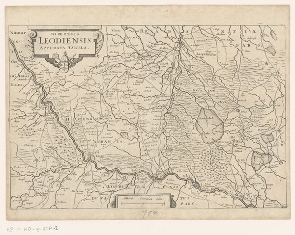Curator: Looking at this map, I feel a certain quiet curiosity—a whispered promise of forgotten paths and whispered place names. There's a dense network of lines, like the veins of a leaf, evoking a world carefully mapped and measured. Editor: This engraving, "Kaart van het hertogdom Gulik," dating from roughly 1636 to 1680, offers more than just a visual record; it's a statement of power and control. Anonymous, yes, but the hand behind it served specific geopolitical interests. Curator: Oh, absolutely, the formal stiffness is there—but look closer. There's a delicate dance of light and shadow; tiny villages clustered like secrets shared between hills. I feel invited to wander through this landscape in my mind, untethered to the strategic intents, if only for a little while. Editor: But to untether oneself completely would be a mistake. These maps are not innocent records of topography. The very act of mapping normalizes spatial control and claims. Who held the power to define borders, to name places, to represent the landscape in a particular way? These choices serve the agenda of those in charge. Curator: Agreed, I acknowledge the undeniable thread of colonialism running through so many landscapes memorialized this way. But doesn’t art hold multitudes? A beautiful, terrifying duality. Can’t it just be…beautiful…also? Editor: Well, that depends on your definition of beauty! Acknowledging power dynamics does not diminish artistic skill. The baroque style in this landscape presents idealized depictions. This art demands that we unpack the assumptions of cartography in the seventeenth century. Think of how maps continue to affect displacement today. Curator: Okay, I see your point. I have let my whimsical tendencies pull me a little far! This old map and its lines... it seems like a coded promise, both grand and melancholic. Editor: Maps offer a seductive claim of certainty amidst profound uncertainties. They invite you to follow familiar paths and also interrogate forgotten narratives and historical blind spots.