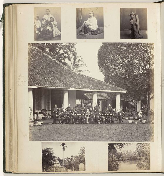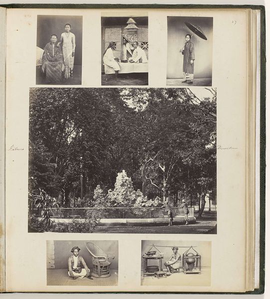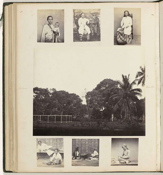 This is a page from an album, "Dierentuin, portretten en beroepen," by Woodbury & Page. Here, a matrix of smaller photographs is carefully arranged on a larger page, creating a formal structure that invites the viewer to consider the relationships between the images. Each photograph, a world unto itself, is contained within strict geometric borders. The portraits at the top establish a clear hierarchy, with the subjects posed formally. The landscape at the center presents a stark contrast with its expansive space and organic forms. Finally, the lower pictures showing workers are capturing candid moments of everyday life. The composition's structure, with its contrasting scales and varying degrees of formality, challenges the viewer to find connections. It prompts us to consider how these visual elements can destabilize conventional meanings. Through this interplay, the album becomes not just a collection of images but a dynamic field for exploring the semiotics of representation, power, and place.